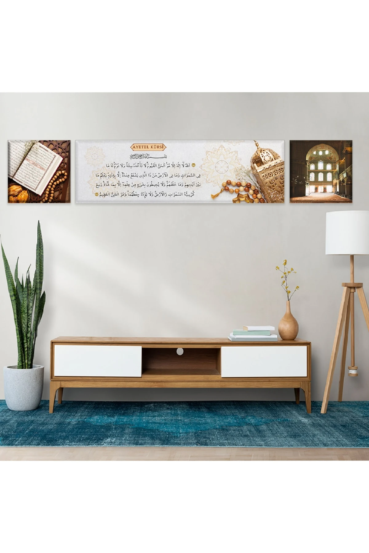 DUVARDA KAPLADIĞI TOPLAM ALAN 160 X 30 CM'DİR. 2 PARÇASI 30 CM, DİĞER UZUN PARÇASI İSE 100 CM'DİR. 3 CM FIRINLANMIŞ AHŞAP ŞASE KULLANILMIŞTIR. BU ŞASELERİN ÜSTÜNE DİJİTAL BASKI KANVAS KUMAŞ İLE HAZIRLANMIŞTIR. DIŞ MEKAN BASKI YÖNTEMİ İLE BASILDIĞI İÇİN ÖMÜR BOYU SOLMAMA GARANTİLİDİR. BU SAYEDE UZUN SÜRE GÖNÜL RAHATLIĞIZYA KULLANABİLİRSİNİZ. ÇİVİ YARDIMI İLE DUVARA ASILMAKTADIR.