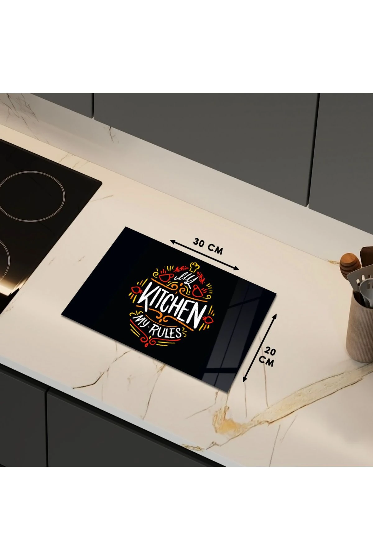 Cam Kesme Tahtası Siyah Arka Planlı Sarı ve Kırmızı Desenli Yazılı
