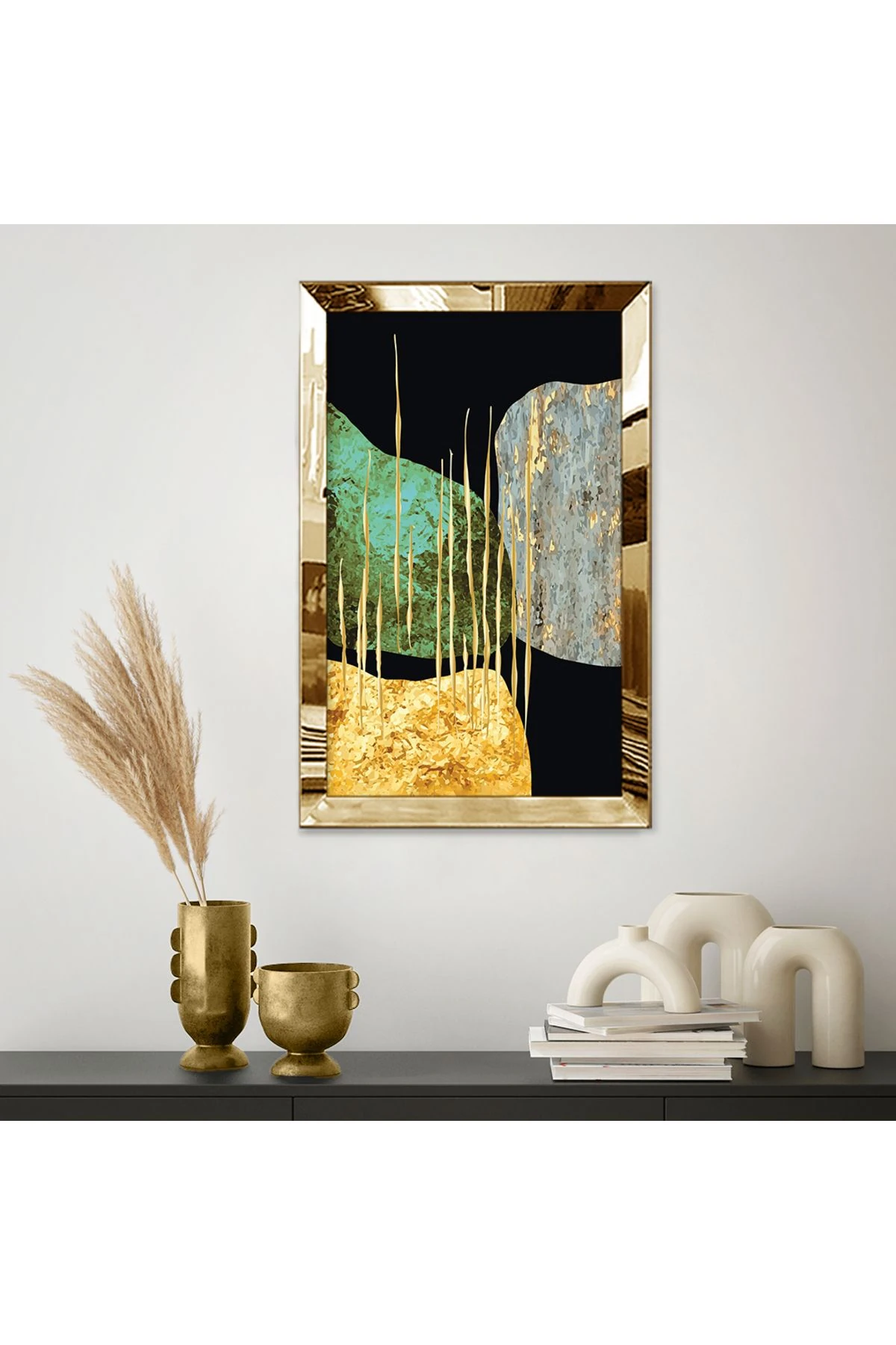 Gold Aynalı Pleksi Çerçeveli Altın Desenli Soyut Şekiller Mdf Tablo