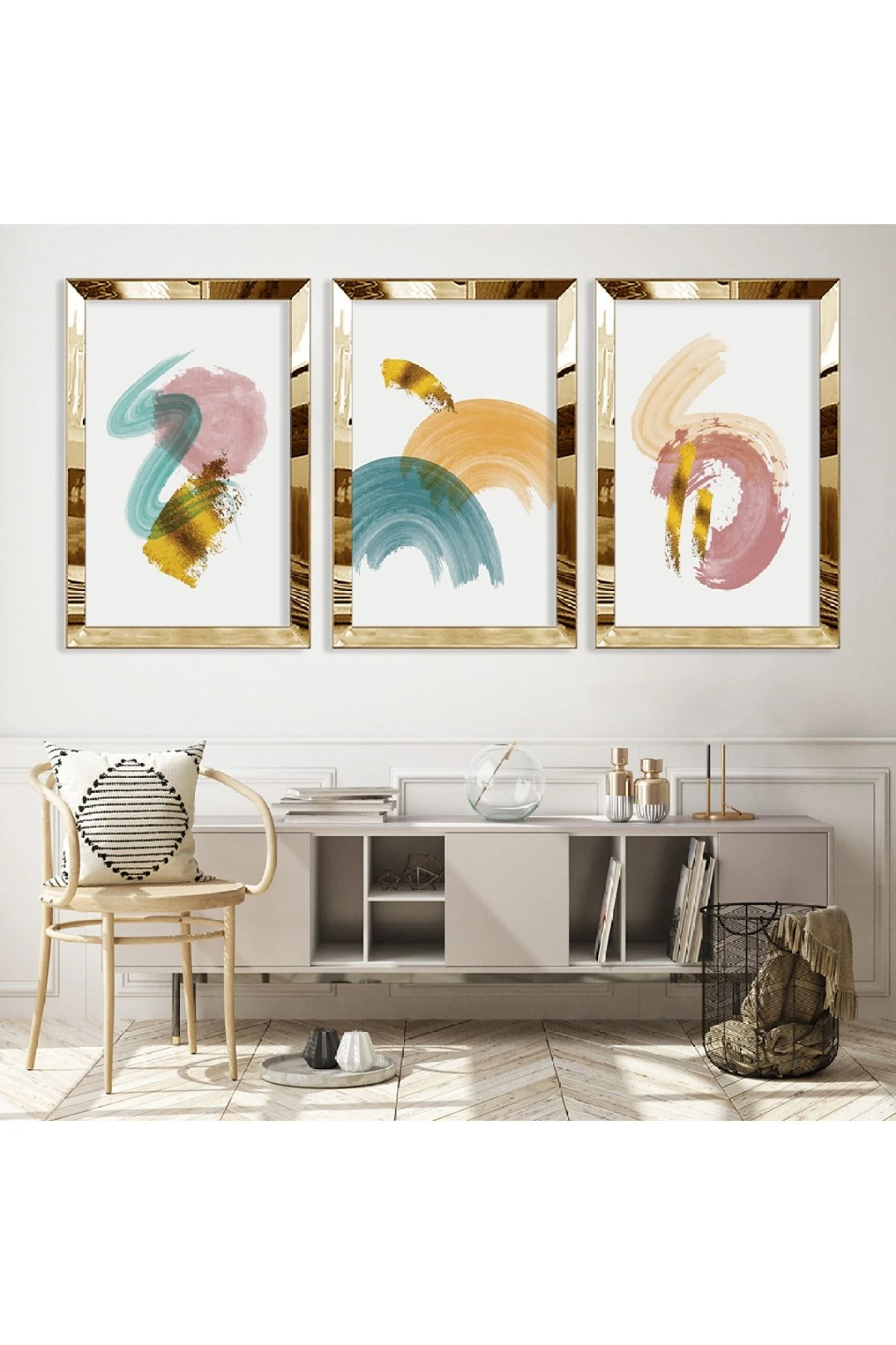 Gold Aynalı Pleksi Çerçeveli Aynalı Üçlü Mdf Tablo Seti
