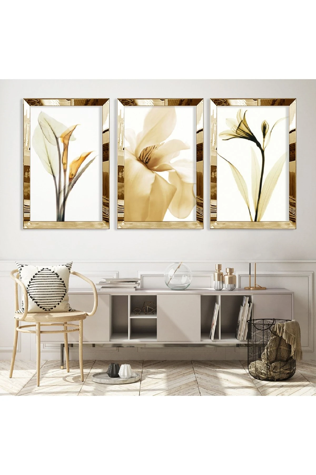 Gold Aynalı Pleksi Çerçeveli Beyaz Çiçek Üçlü Mdf Tablo Seti