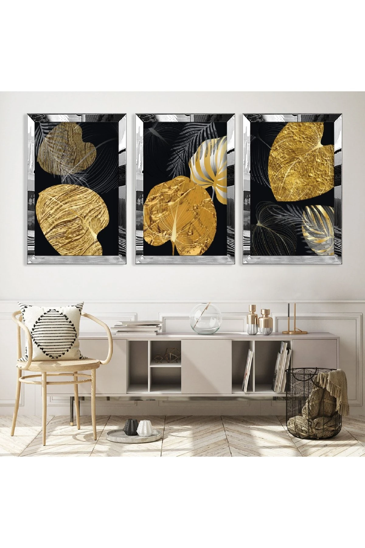 Gold Aynalı Pleksi Çerçeveli Renkli Üçlü Mdf Tablo Seti