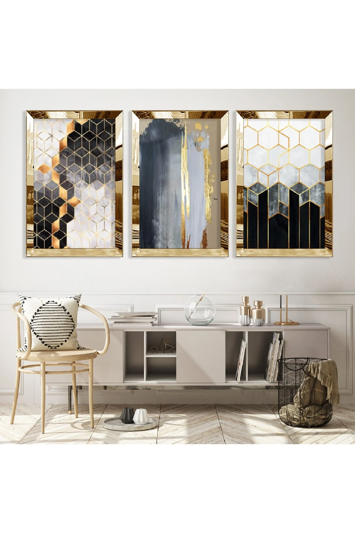 Gold Aynalı Pleksi Çerçeveli Soyut Desen Üçlü Mdf Tablo Seti