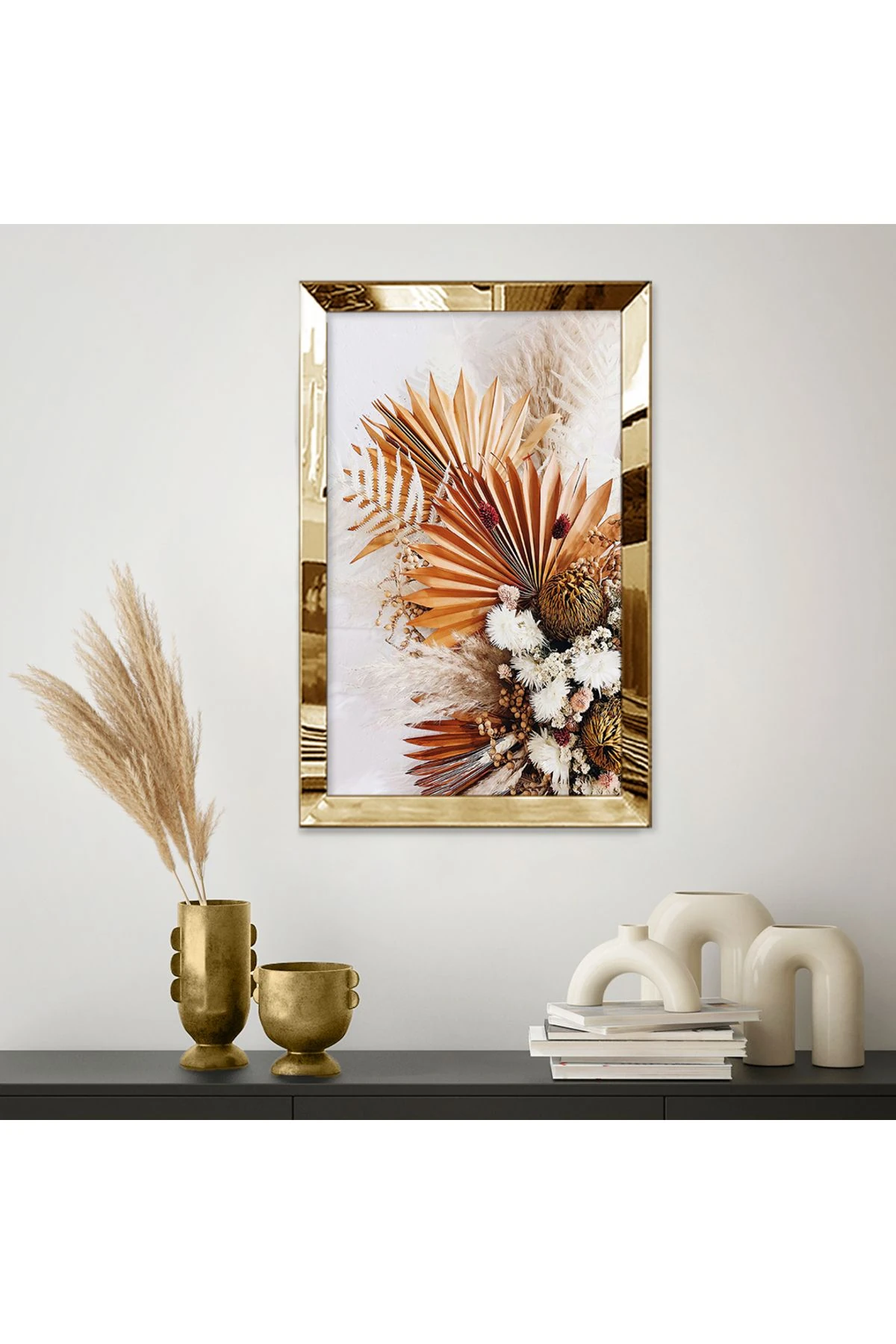 Gold Aynalı Pleksi Çerçeveli Turuncu Ve Beyaz Çiçek Aranjmanı Mdf Tablo
