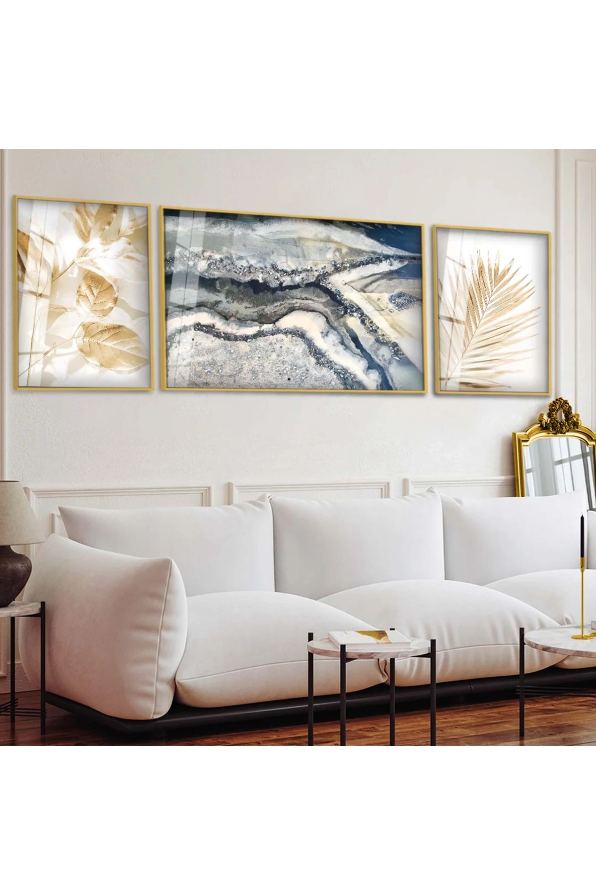 Oturma Odası Tablosu Kolaj Çizim 3'Lü Metal Çerçeveli UV Baskı Kırılmaz Cam Tablo