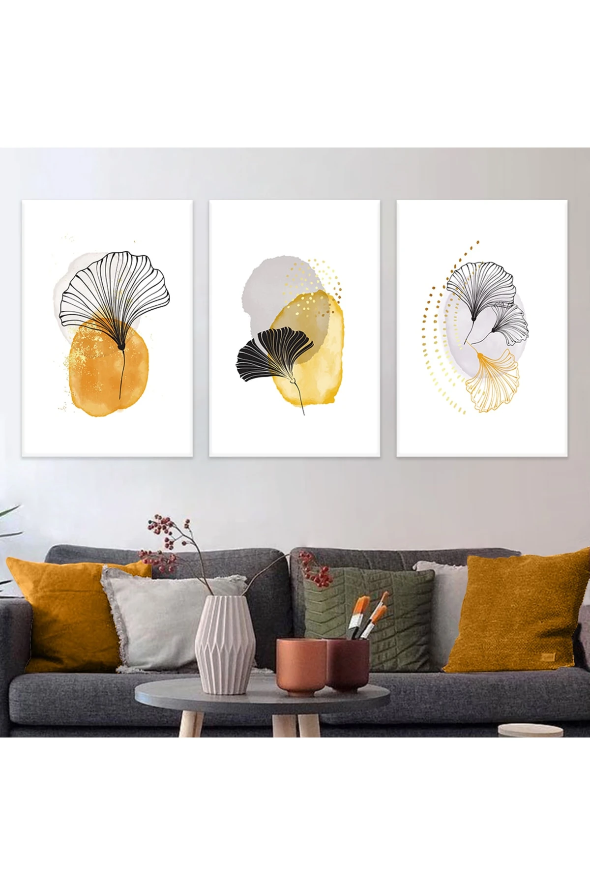 Renkli Soyut Desen Yaprak 3'Lü Ahşap Şase Dijital Baskı Kanvas Tablo