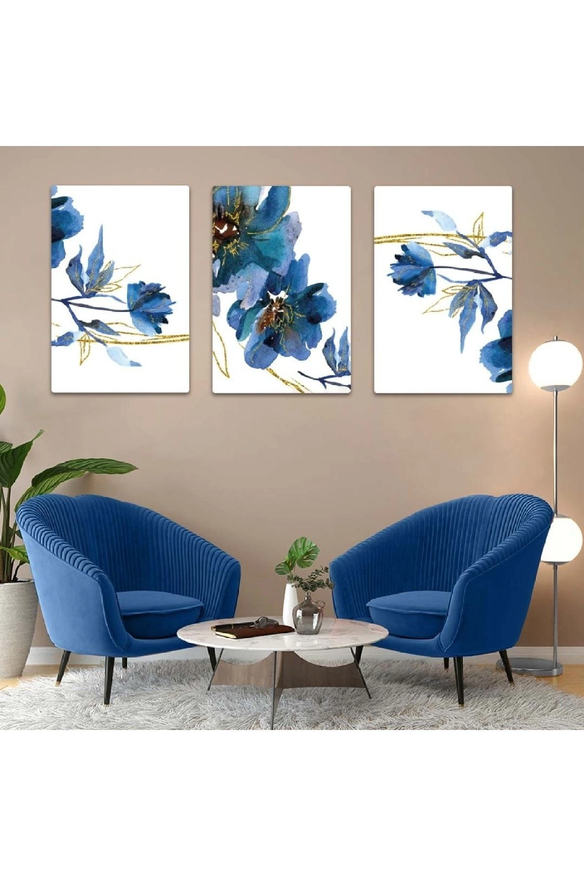 Üçlü Mdf Mavi Çiçek Tablo Seti